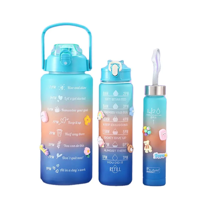 💧 TRU 3 in 1 Motivational Water Bottle Set: We guarantee a highly reliable and safe motivational water bottle set for Men Women and Kids. With a variety of colors and size options, adapt to the best lifestyle and good health with the right choice for your day-to-day needs and activities.💧 Set of 3: Acquire the value package for a variety of purposes and at different capacities ranging from 2000ml, 900ml, and 300ml. Our Measurement Water bottle Set is printed with time and inspirational quotes that help you track the amount of water you intake. Also, it helps you to stay consistently hydrated in your fitness journey.💧 Superior Design: Sipper Water Bottle is lightweight and durable. Crafted with unique quotes and a timer, our motivational water bottle makes you stay away from dehydration. The corners and edges are finely polished for a smooth finish and give a classy look. It also has a Non-toxic removable straw to enjoy your drink easily without spilling. Our Drinking Water Bottle is integrated with a handle design that has an anti-skid property and is easy to carry anywhere.💧 High-quality material: Our transparent water bottle is made of premium quality Tritan co-polyester plastic that is 100% Non-toxic and BPA-free. The detachable silicone straw is included to help you have a spill-proof sipping. Reusable and Easy to clean. A must-have for any fitness goals including weight loss, appetite control, and overall health.💧 One Hand Open Water Bottle: Inspirational Gym Gallon is equipped with a flip-top lid that is secured with a lock to keep your bottle dust-free and leakproof. Structured with a press button the lid can be easily opened with a single hand just by a click. Our water gallon has a smooth wide opening, so it is easy to put some ice or fruits in it.💧 Daily Adequate Intake: Use for individual use in a variety of environments, or to keep your family hydrated throughout the day, a package of healthy benefits. Whether you are at the Office, Home, Gym, Hiking, Camping, Travelling, or anywhere around our Timer Water Bottle encourages healthy hydration as a part of your lifestyle, and its quotes, measurement scales, and reminders motivate you to drink enough water all day.